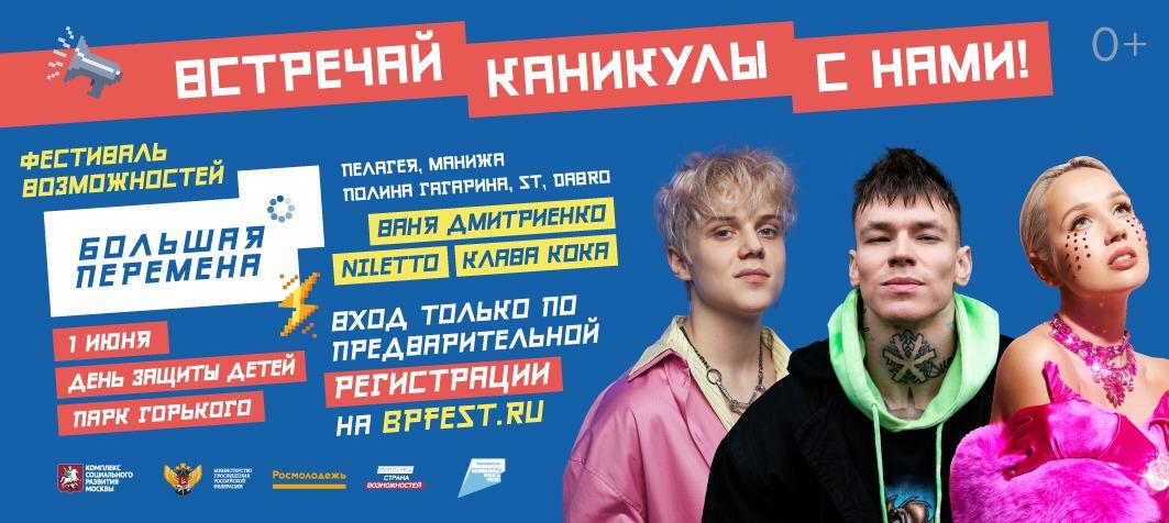 1 июня в Международный день защиты детей в Москве на набережной Парка Горького состоится Всероссийский фестиваль «Большая перемена». Фестиваль станет точкой сборки современных проектов для детей и территорией открытия новых талантов.
